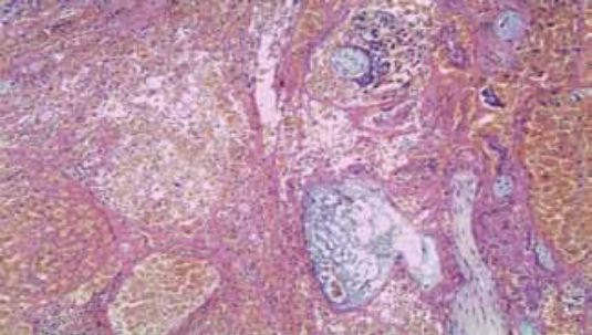 Рисунок 1. Срез эндометрия: лейкоцитарная инфильтрация стромы, фибриноидный некроз, тромбоз спиральных артерий. Окраска гематоксилин-эозином, увеличение 250×.
