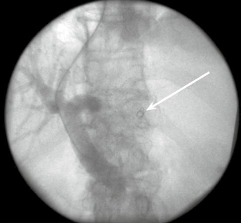 Рисунок 4. Ангиограмма больного К., 72 г. (контрольная портограмма после выполнения эмболизации спиралями Gianturco левой желудочной вены через сформированный внутрипеченочный канал). Стрелкой указана спираль Gianturco.