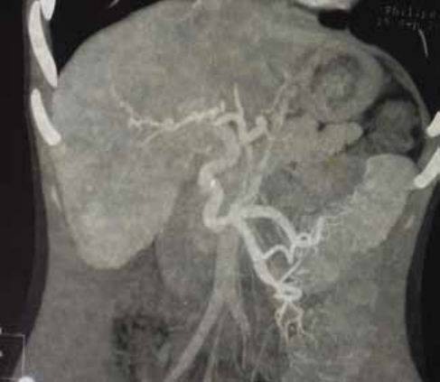 Благоприятный исход операции TIPS/ТИПС с эмболизацией желудочных вен демонстрируется на примере пациента К. 72 лет с циррозом печени вирусной этиологии, варикозным расширением вен пищевода и желудка III ст. (в анамнезе 2 эпизода кровотечения, острый инфаркт миокарда 12 лет назад), постгеморрагической анемией, асцитом, хронической печёночно-клеточной недостаточностью класса С (8 баллов по Child-Turcotte-Pugh), печёночной энцефалопатии I стадии (рис. 4). Спустя 5 лет после операции анализ результатов и эффективности лечения установил отсутствие рецидивов кровотечения, регрессирование варикозного расширения вен пищевода и асцита, отсутствие прогрессирования печёночной недостаточности. На 79-м году жизни пациент К. умер от двусторонней пневмонии, явившейся осложнением ОРВИ.