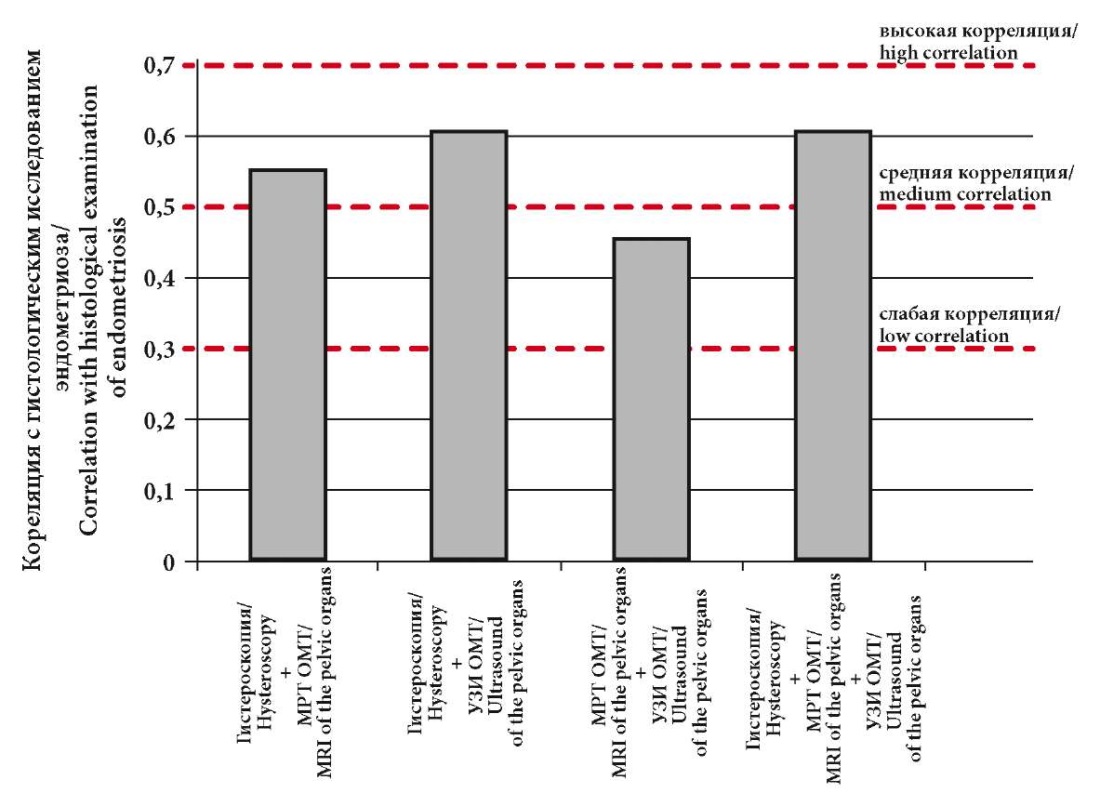 Рисунок 4. Корреляции различных методов диагностики эндометриоза с результатами гистологического исследования
